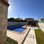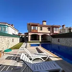 Az Çeşme városi villa a medencére nyílik. A 2 fürdőszobás villa magába foglal egy fürdőszobát külön WC-vel és zuhanyzóval. A kényelmes tartózkodásért fürdőlepedők és papucsok is biztosított.